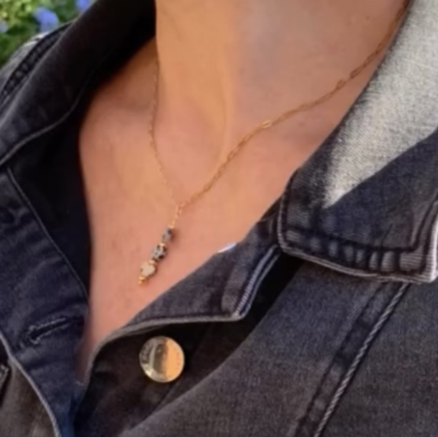 Collier en acier inoxydable doré agrémenté d’un pendentif de 3 perles coeur dalmatien.